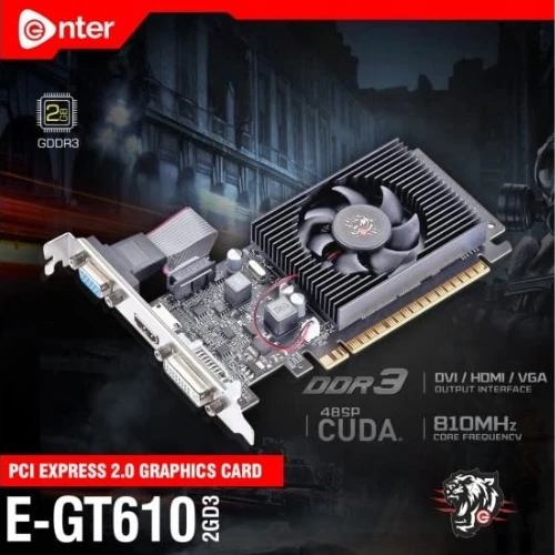 The Enter E-GT610 2GD3 is a budget-friendly PCI Express 2.0 graphics card featuring a 2GB DDR3 memory and NVIDIA GT218 GPU with 48 CUDA cores. Designed for everyday desktop computing, it supports output through VGA, HDMI, and DVI, making it ideal for dual-display setups. With a core clock speed of 810MHz and memory speed of 1000MHz, it delivers smooth video playback, casual gaming, and graphic-intensive applications. Its single-fan cooling ensures consistent performance, while the 3-year warranty offers peace of mind.